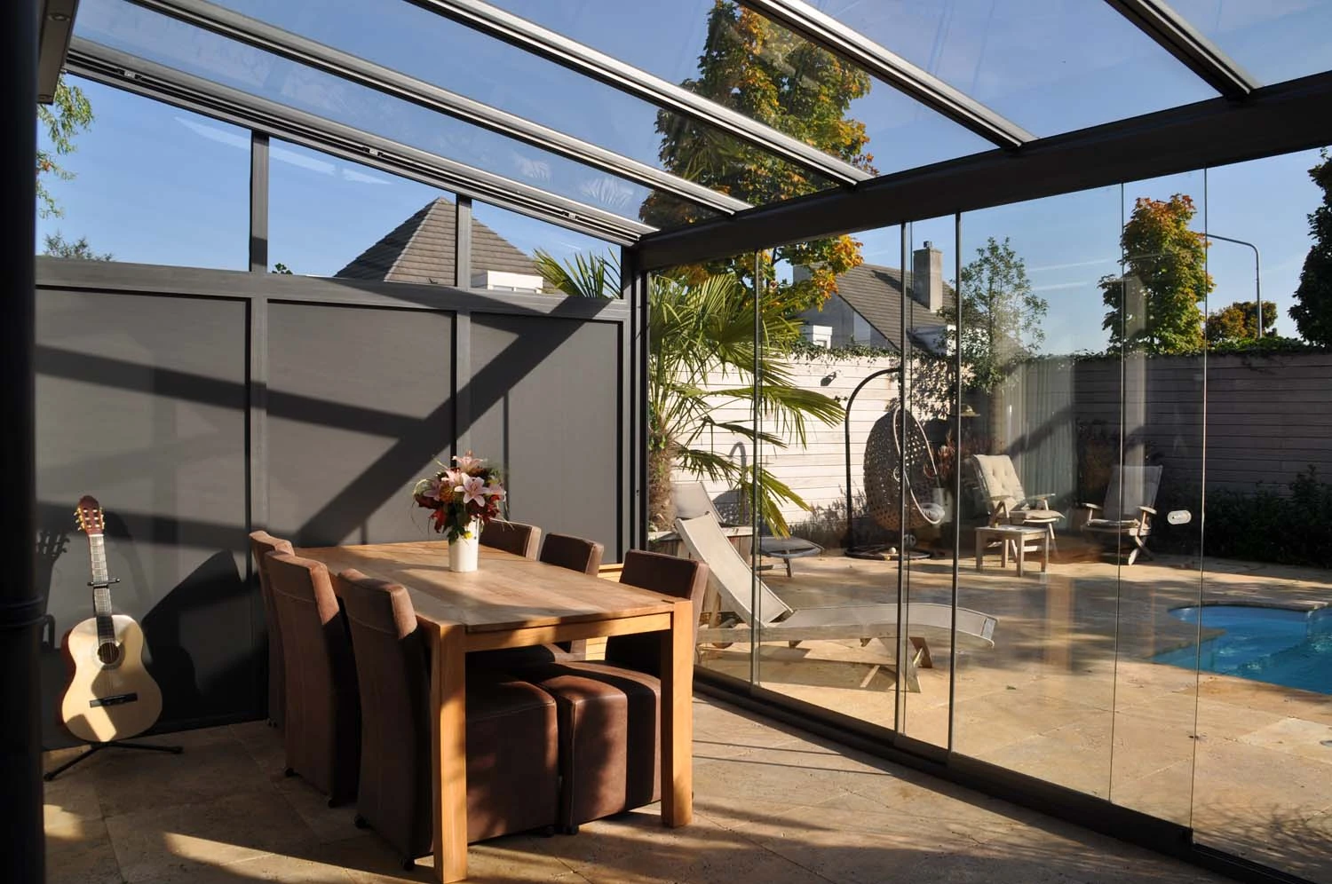 Bei den meisten Konstruktionen können Sie Glaselemente und Senkrechtmarkisen gleichtzeitig verbauen.